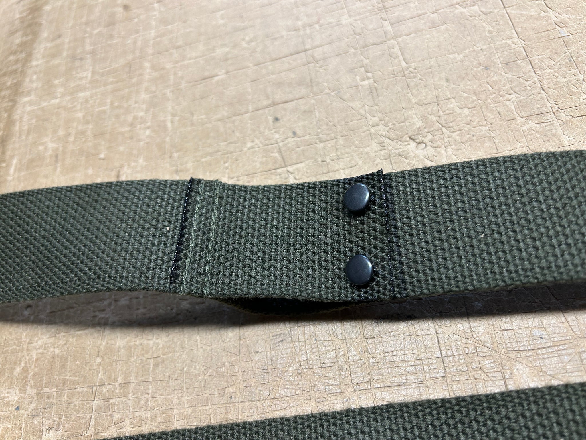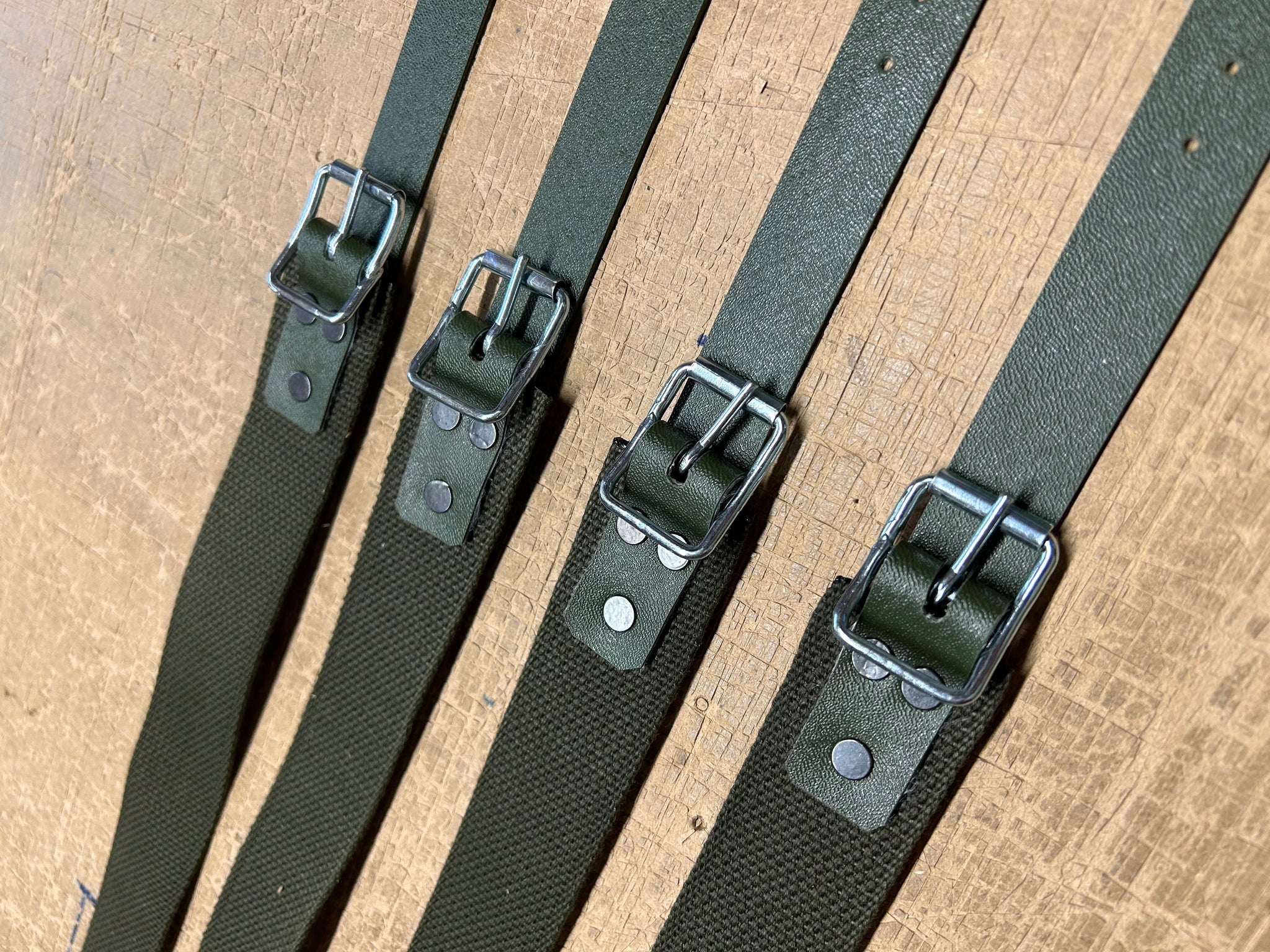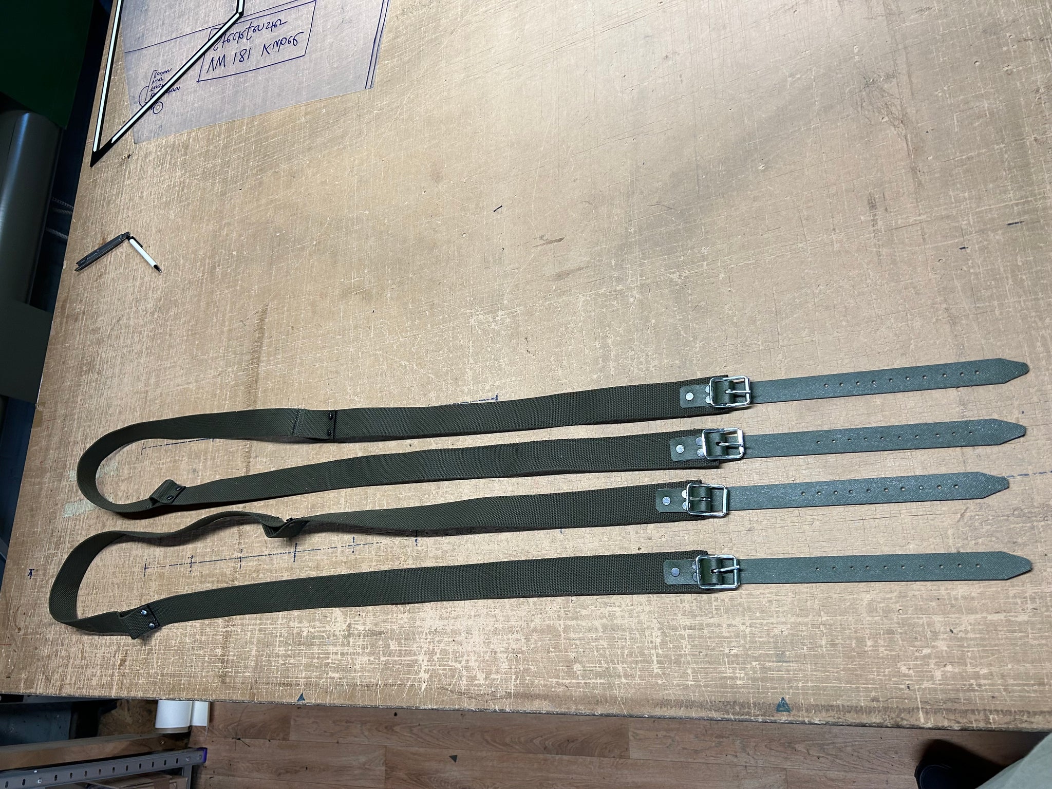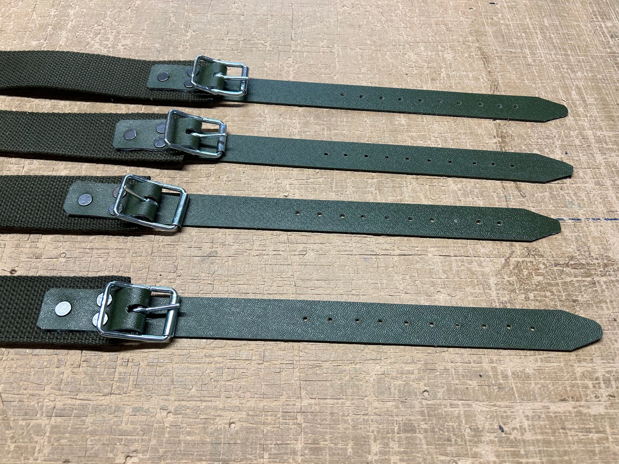 Zwei neue Verdeckspanngurte für das Verdeckgestell des DKW Munga an. Das Material ist Baumwolle/Polyester und PVC mit einer Gewebeeinlage, es ist sehr robust. Für das Munga Verdeck werden zwei solcher Riemen benötigt.Die Riemen werden mit den zugehörigen Nieten zur Befestigung am Verdeckgestell geliefert.