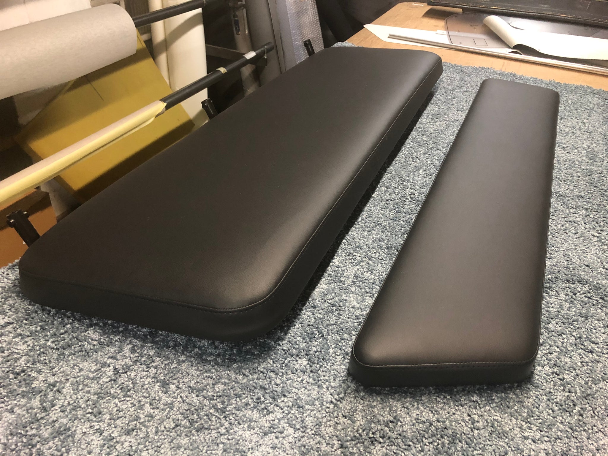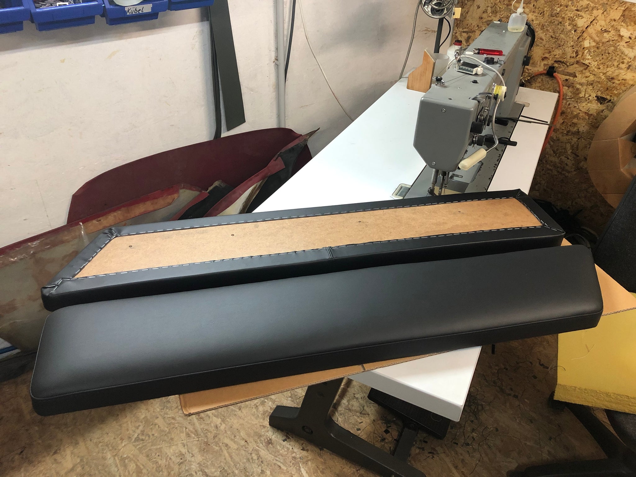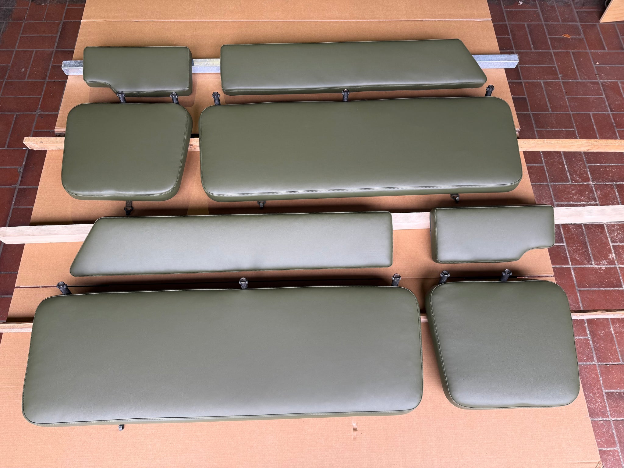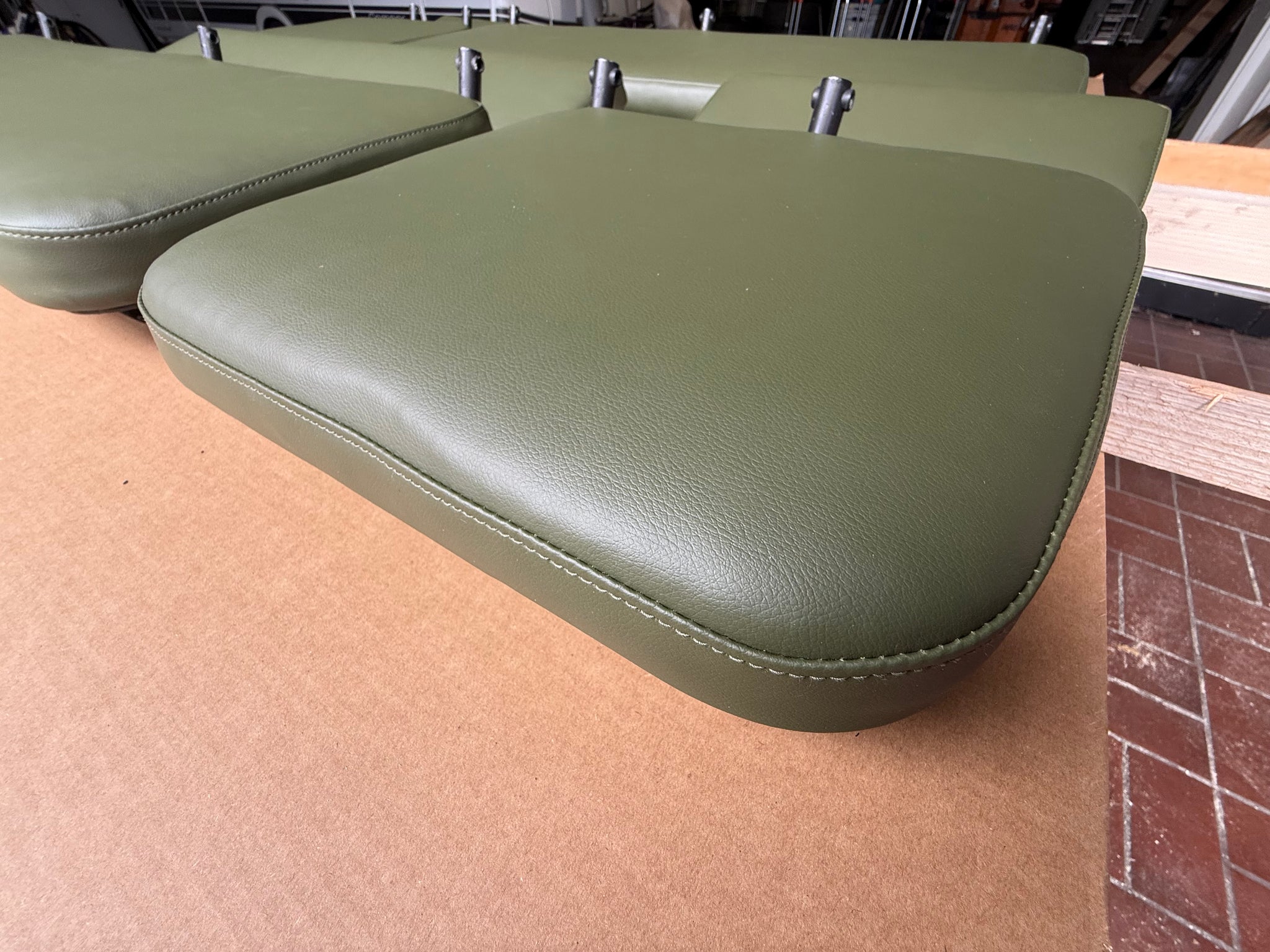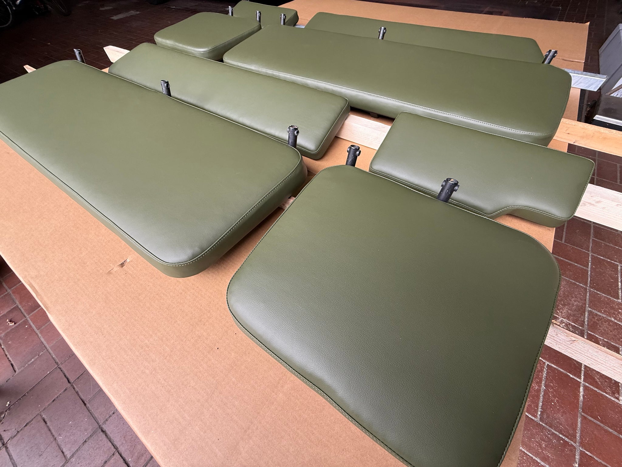 D.h. je zwei Bezüge für die Rückenlehnen und zwei Bezüge für die Sitzflächen der langen Bank und des Einzelsizes im Fond. Die Bezüge sind vernäht und haben die gleiche Passform wie das Original. Sie müssen an der Unterseite auf die vorhandenen Platten festgetackert werden.